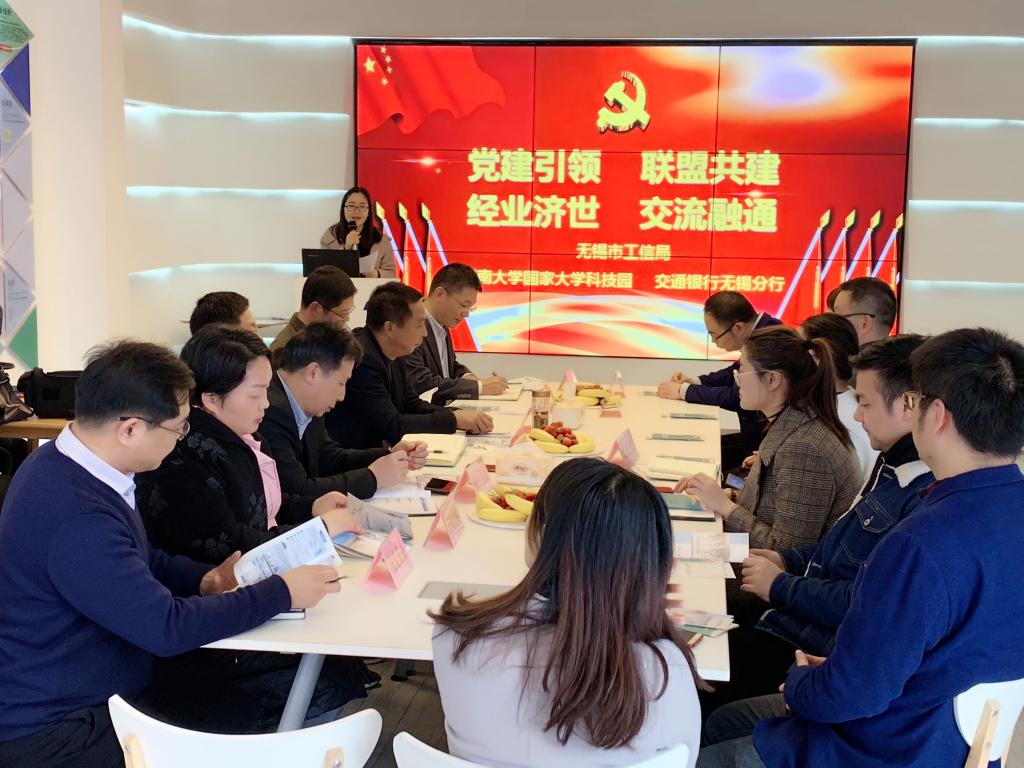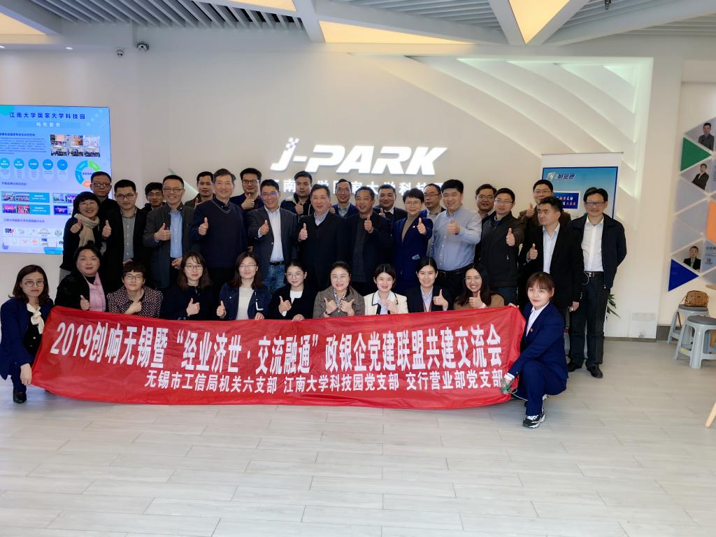 2019年3月20日,为坚持党建引领,实现党建工作与业务发展“双促进”“双丰收”,无锡市工业和信息化局机关六支部、交通银行无锡分行营业部党支部、我校国家大学科技园党支部联合举办了2019“创响无锡”暨“经业济世 交流融通”政银企党建联盟共建交流会。无锡市工信局产业金融处处长郭波、交通银行无锡分行营业部总经理邰晓蕾、大学科技园党支部书记马火清、大学科技园11家在孵企业党员骨干、无锡市工业和信息化局机关六支部、交通银行无锡分行营业部党支部、大学科技园党支部部分党员代表共计30余人出席本次活动。