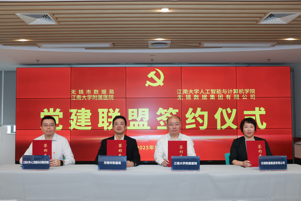 签约仪式上,无锡市数据局党组书记、局长胡逸,江南大学人工智能与计算机学院党委书记魏珍吉,江南大学附属医院党委书记过栋,以及无锡数据集团党委书记、董事长陈琦共同签订党建联盟协议,标志着四方在组织共建、资源共享、发展共谋方面迈出关键一步。