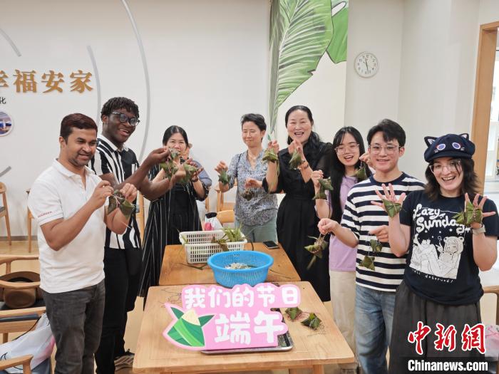 在炭煮·茶门店,中外友人围坐在一起,悠然品茗并亲手制作端午香包,茶香氤氲中,传统民俗文化与现代都市生活完美交融;在社区“智惠”食堂内,大家分工协作,一起包粽子,提前感受端午节的浓厚氛围。