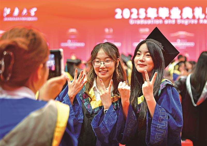 【江南晚报6月22日】6月21日,毕业生在江南大学2025年毕业典礼暨学位授予仪式现场拍照留念。