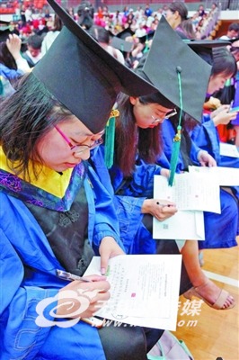 22日,毕业生在毕业典礼现场给自己写下留言,待若干年后回校时再打开信封回味留言。