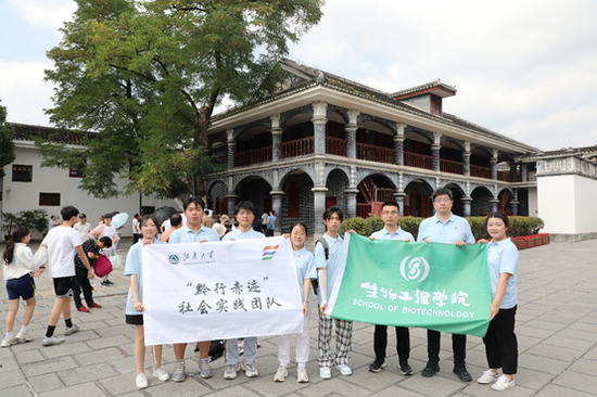 【中国新闻网7月15日】为引导学生在社会课堂中“受教育、长才干、作贡献”,组织学生向实践学习。近日,江南大学生物工程学院“黔行赤迹”暑期社会实践团赴贵州遵义开展社会实践。本次社会实践以“西黔赤迹路漫漫,酒旅融合闯新征”为主题,围绕理想信念教育、红色文化学习、企业科技服务等为主要内容,通过实地走访、调查访谈、座谈交流等方式,走进历史现场,走入行业典范,走实社会课堂。
