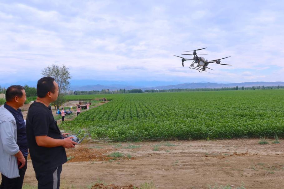 七月正值棉花花铃期,需要对棉花进行打顶、施肥。棉农王超刚正操控着无人机喷洒农药。“现在无人机打药非常方便,依靠北斗卫星导航系统就能按照设置好的路线自动打药,不需要一直操控。”他告诉援疆团成员。