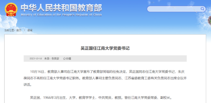 【安徽网10月16日】据教育部网站消息,10月16日,教育部人事司在江南大学宣布了教育部党组的任免决定,吴正国同志任江南大学党委书记,朱庆葆同志不再担任江南大学党委书记职务。教育部人事司主要负责同志、江苏省委教育工委有关负责同志出席会议并讲话。