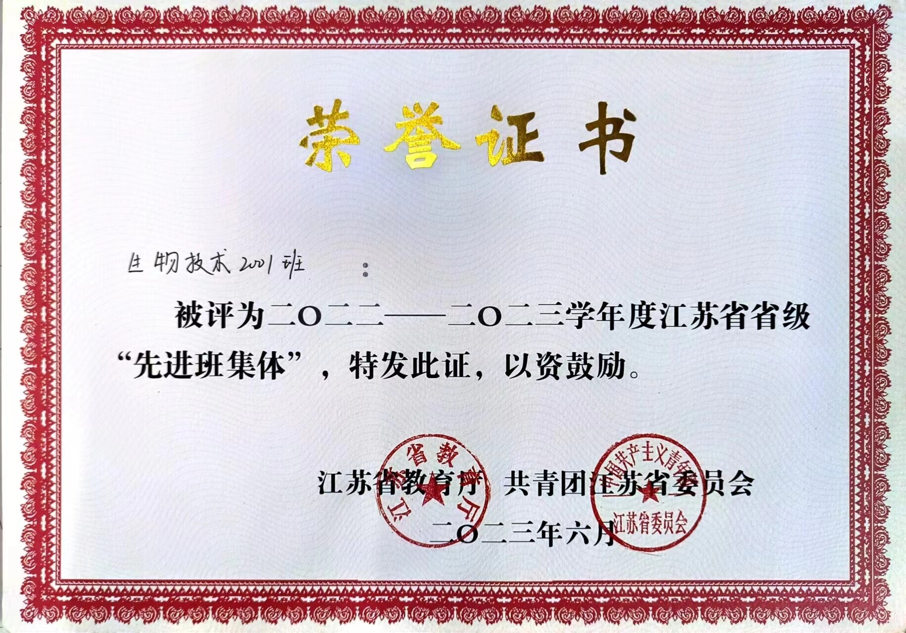 图为两人所在班级获江苏省省级“先进班集体荣誉”。中国青年网通讯员 钟泽 摄