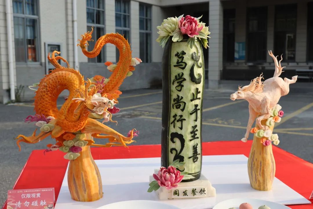 【交汇点新闻11月16日】巨型面塑八仙过海,锦绣江南、龙马精神、麒麟献书、蛟龙出海……近日,在江南大学第十一届美食文化节上,一盘盘别出心裁的果品雕刻引来师生驻足观看,连连叫绝。