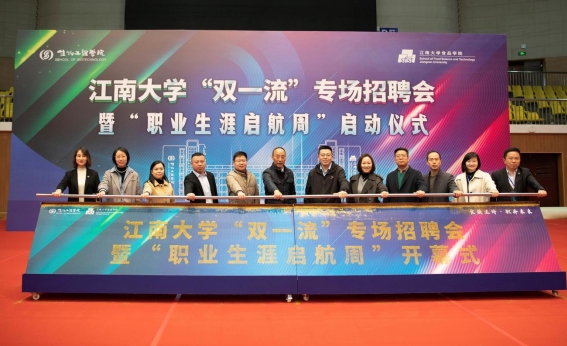 江南大学党委常委、统战部部长朱飞,无锡市人社局人才开发和对外合作处副处长吴莹,上海喜庆日供应链管理有限公司总经理吴琼,融媒体中心主任兼党委宣传部副部长胡振宇,团委书记魏珍吉,社会合作与校友联络处处长周云龙,就业指导中心主任兼学生工作处副处长单筱婷,教务处副处长吴宝锁,食品学院党委书记傅莉莉,生物工程学院党委书记程捷音,食品学院党委副书记兼副院长李雷,生物工程学院党委副书记兼副院长林丹出席开幕式。开幕式由李雷主持。