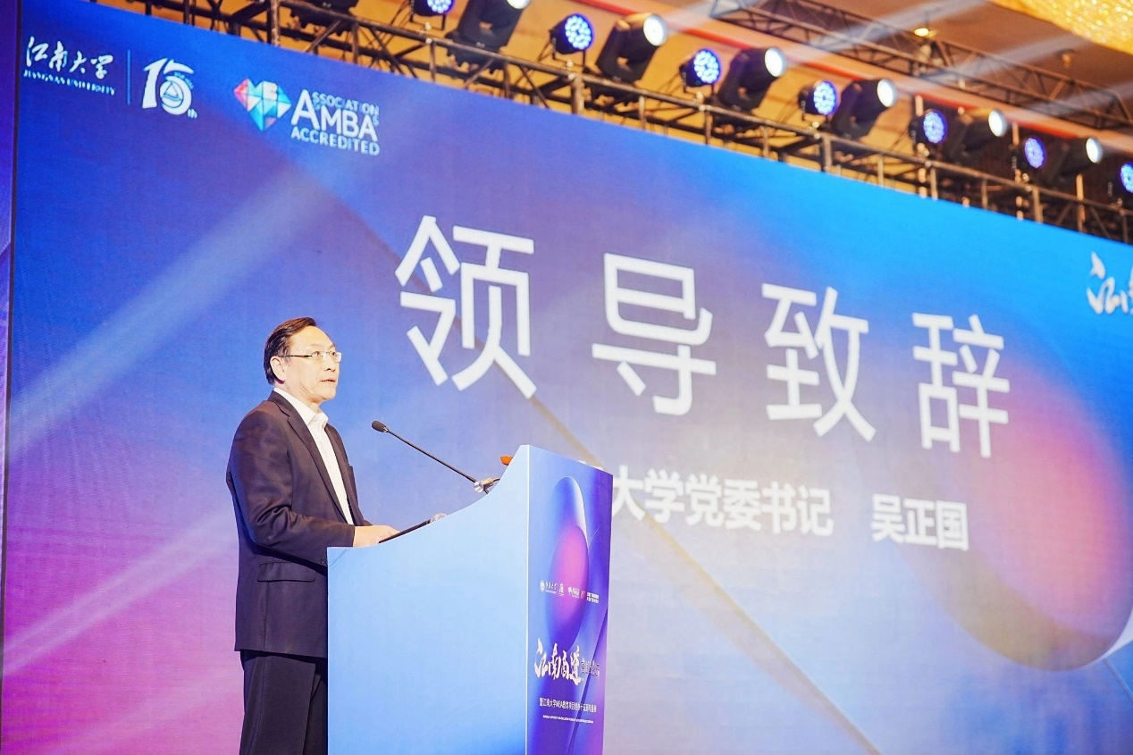 论坛伊始,江南大学党委书记吴正国致辞,吴书记对长期以来给予江南大学和江南大学商学院关心、支持和帮助的各位领导专家表示了衷心感谢,并介绍了江南大学和江南大学商学院发展情况。他表示,江南大学MBA作为江南大学研究生特色教育项目,始终致力于以厚植江南工商文化,立足中国管理实践,贡献商科学术新知,培养未来商业领袖赋能地方经济发展。最后,吴书记预祝本次高峰论坛活动取得圆满成功。
