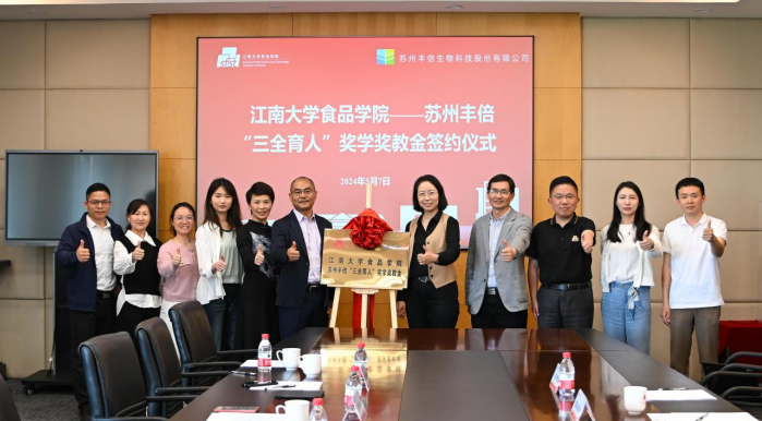 随后,院企双方签订捐赠协议并为“江南大学食品学院——苏州丰倍‘三全育人’奖学奖教金”揭牌。据悉,此次苏州丰倍在江南大学设立首个以“三全育人”为主题的二级学院奖学奖教金,着重激励在大学生思想政治工作和育人全过程中付出心血努力和作出卓越贡献的食品师生,旨在积极构建企业和高校之间的产教融合创新平台,全力支持江南大学食品学院立德树人、率先垂范,为健康中国建设和国计民生发展贡献源源不断的智慧和动能。