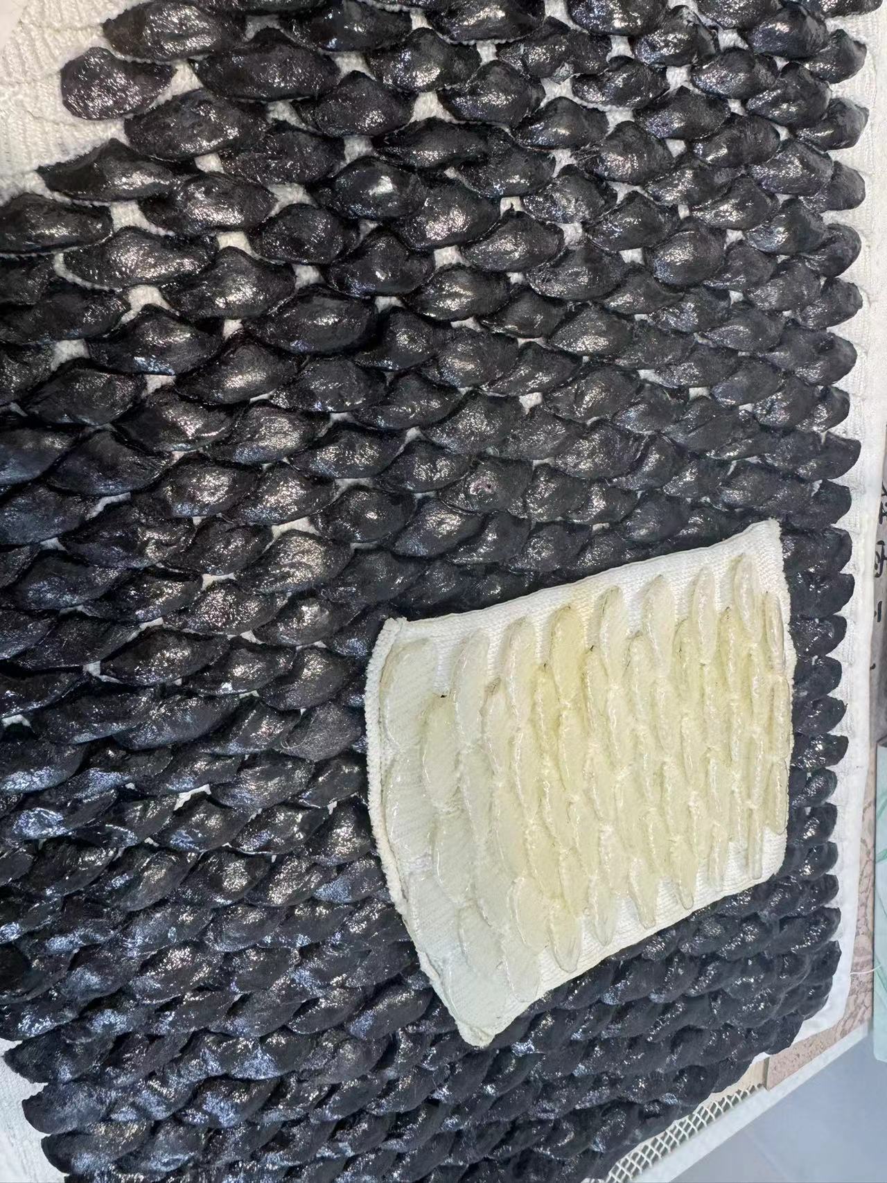 为了让“人造蛇皮”更“高级”,团队又发挥针织技术的高成形灵活性,以高性能纱线超高分子量聚乙烯为原料,设计鳞片织物组织结构与编织工艺,在全成形电脑横机上一体化编织了仿生鳞片织物,实现了鳞片层与织物底层的整体无缝衔接。