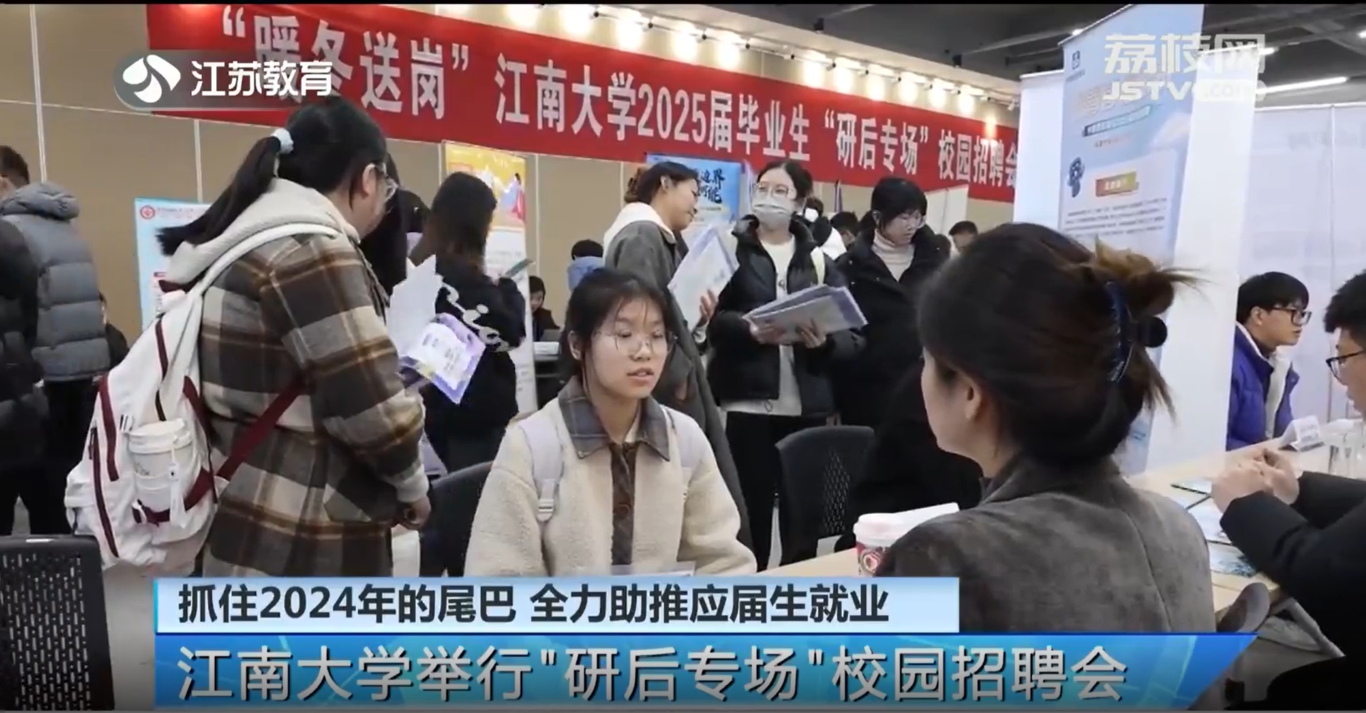 【江苏教育频道12月31日】12月31日晚,江苏教育频道《江苏教育新闻》栏目以“抓住2024年的尾巴 全力助推应届生就业 江南大学举行‘研后专场’校园招聘会”为题,报道我校就业育人工作情况。