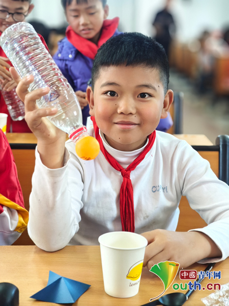 实验“不会掉的乒乓球”,旨在让学生们切身体验大气的压力。学生们用乒乓球堵住装满水的瓶子后把瓶子倒过来,惊奇地发现乒乓球没有掉下来。马一籴为学生们解释了实验现象背后的原理知识,并介绍了应用大气压力工作原理的生活电器——吸尘器。
