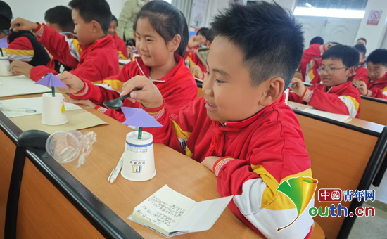 在“会转动的纸”的实验中,马一籴指导学生们在头发上摩擦塑料勺,再用塑料勺靠近纸片,发现了纸片会跟随塑料勺转动。实验结束后,马一籴为学生们科普了静电产生的原理,以及这一原理在生活中的应用实例——静电除尘器。