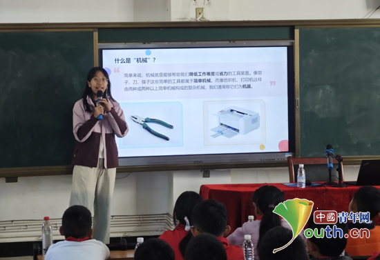 活动伊始,主讲人马一籴带领学生们认识了什么是“机械”以及“机械”的分类。随后,她为学生们展示了三个科学小实验,带领他们体验科学探索的乐趣并认识科学实验的工作原理。