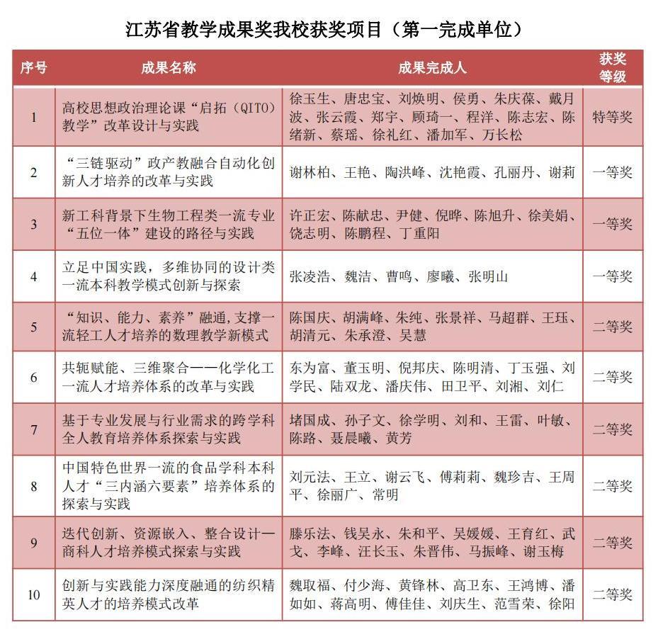 近日,江苏省教育厅正式发布了《关于公布2021年江苏省教学成果奖获奖项目的通知》(苏教人〔2022〕4号),我校作为第一完成单位喜获10项江苏省教学成果奖,其中特等奖1项、一等奖3项、二等奖6项,获奖总数位列全省并列第五。