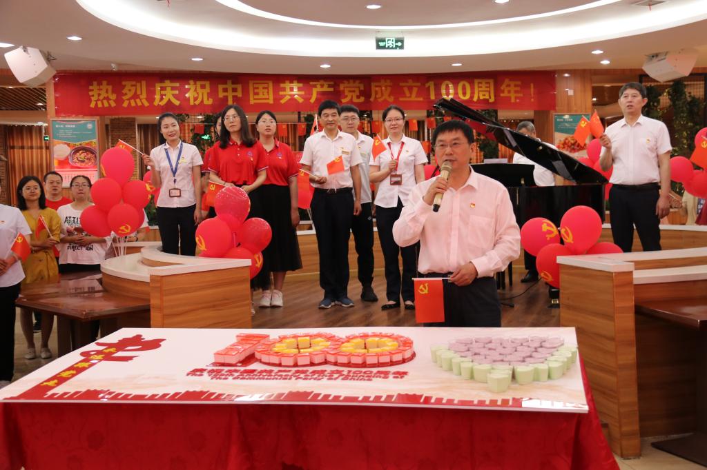 在活动现场,伴随着熟悉的旋律响起,领唱党员的歌声娓娓道来,激昂的歌声、鼓掌声、欢呼声交相辉映,合唱人员和现场师生们挥舞着手中的党旗、国旗,将快闪活动推向高潮。大家精神饱满、激情澎湃,唱出了感党恩、听党话、跟党走的坚定信念和迎接党的百年华诞的喜悦之情,展现了江南师生对党的赤诚之心和热爱生活、积极向上、与时俱进的精神风貌。除了红歌“快闪”,饮食中心党支部在现场提供了庆祝建党100周年蛋糕,分享甜蜜味道,共享喜悦之情。