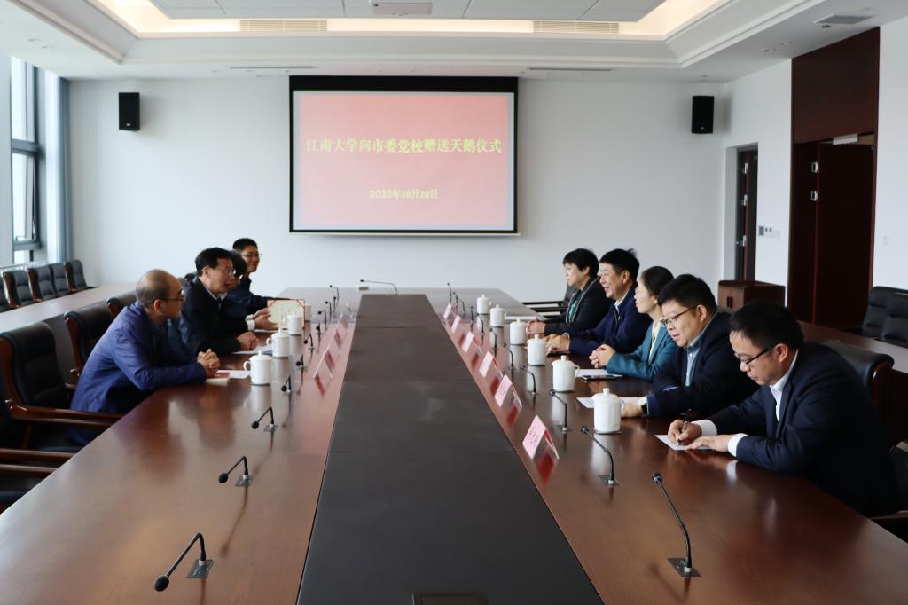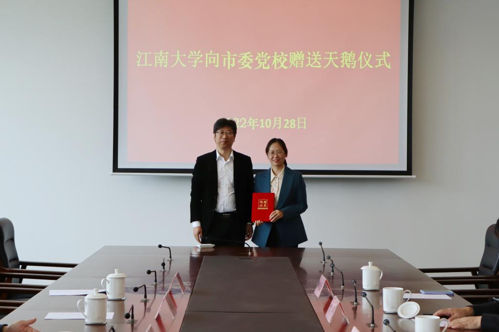 10月28日,江南大学向无锡市委党校赠送黑天鹅仪式在市委党校新校区举行。校党委常委、宣传部部长倪松涛,党校专职副校长兼党委组织部副部长周雪晖,后勤保障系统党委书记叶军,后勤管理处处长刘长青,市委党校副校长成大江、王福波,以及市委党校总务处、保卫处相关部门负责人参加了捐赠仪式。