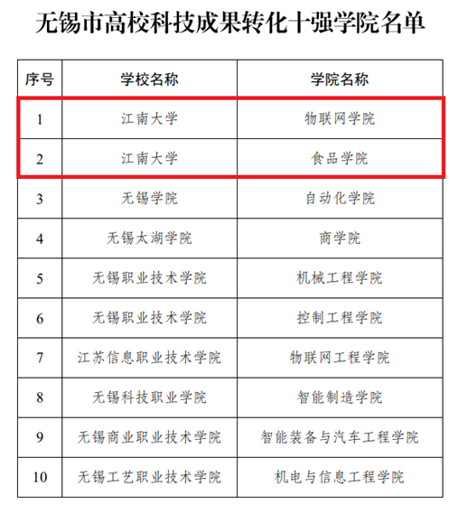 近日,无锡市教育局公布了无锡市高校科技成果转化十强学院名单,我校物联网工程学院、食品学院名列其中。