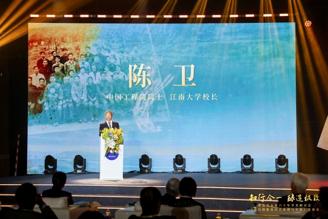 陈卫在致辞中首先代表江南大学全体师生,向江南大学1964届杰出校友、中国酿酒大师、国家非物质文化遗产茅台酒酿制技艺传承人、茅台集团原董事长季克良表示了热烈的祝贺和崇高的敬意。他强调,季克良对科学的创新精神,对国家的奉献精神和对行业的匠心精神,为茅台成为世界蒸馏酒第一品牌打下了坚实基础,是茅台发展史上的重要人物。
