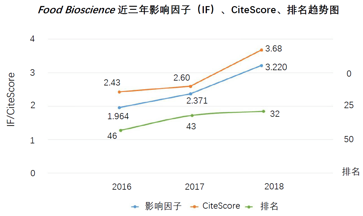 根据最新发布的2019版《期刊引证报告》(Journal Citation Reports,简称JCR),由我校与Elsevier科技文献出版集团合作主办的食品类英文期刊Food Bioscience(以下简称FBIO)影响因子由去年的2.371提升到3.220,突破影响因子3的关口,在国际食品科学领域发表原创论文的135种期刊中排名32位,从JCR二区跃升至JCR一区。另据本月初Scopus数据库发布的2019年最新数据,FBIO的CiteScore指数由去年的2.60提升至3.68。两个期刊评价指标不断提高,表明本刊的国际影响力持续提升。