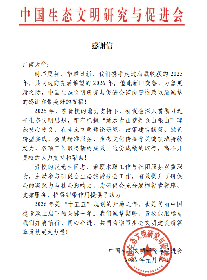 近日,江南大学收到中国生态文明研究与促进会发来的感谢信,高度赞扬我校退休教师张光生教授在生态文明建设领域的突出贡献。作为国家生态文明建设的重要智库,该会特别致信感谢这位年逾花甲仍躬耕不辍的“银发先锋”。
