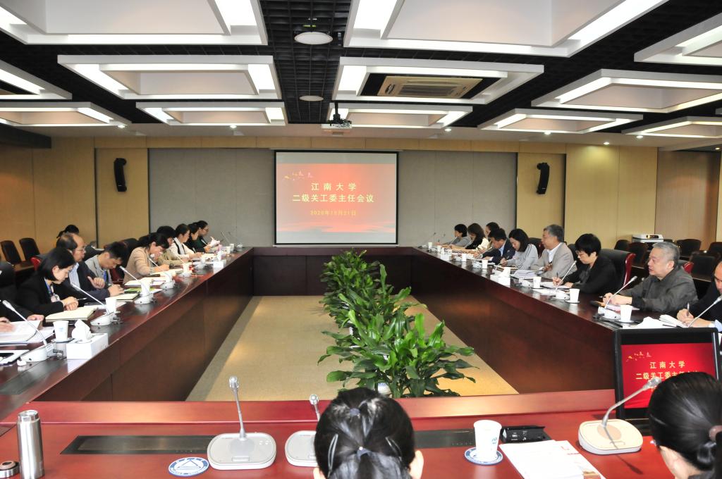 10月21日上午,江南大学二级学院关工委主任会议在行政楼307会议室举行。校关工委常务副主任娄国栋,学生工作部部长、校关工委委员张菁燕,离退休党工委书记、校关工委秘书长许群,全校17个学院关工委主任(学院党委副书记)、部分委员单位(部门)负责人,以及校关工委副秘书长等出席,会议由张菁燕主持。
