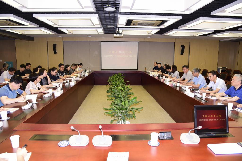 娄国栋还就推进学院关工委优质化建设试点工作进行了部署。会上,许群宣读了《关于公布二级学院关工委优质化建设试点单位的通知》(江大委办[2022]16号)。试点单位生物工程学院党委副书记兼关工委主任周云龙、商学院关工委常务副主任冯群康分别汇报了近年来本学院关工委工作情况,并就做好优质化建设作了表态发言。