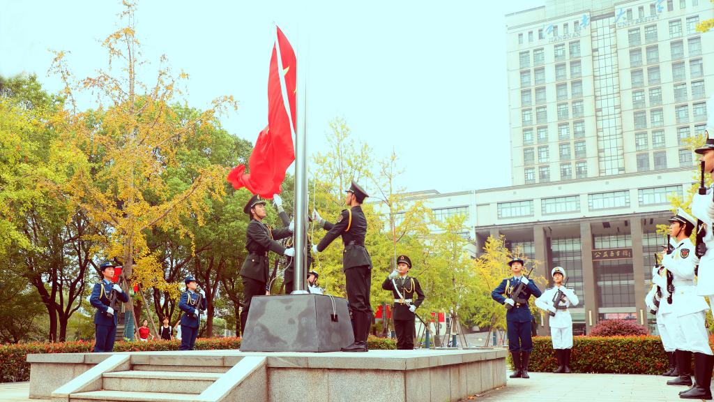 随着《义勇军进行曲》响起,升旗仪式正式开始。江南大学国旗护卫队队员身穿海陆空三军礼服,迈着铿锵的步伐,护卫着国旗走向升旗台。全场人员唱响国歌,向五星红旗行注目礼,见证着中华人民共和国的伟大成就和光辉历程。
