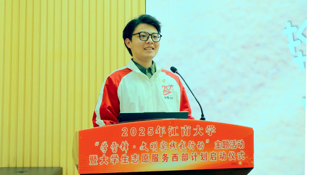 3月5日下午,江南大学2025年“学雷锋·文明实践我行动”主题活动暨大学生志愿服务西部计划启动仪式在蠡湖校区举行。学校党委学生工作部副部长俞立峰、党委研究生工作部副部长陈周、团委副书记单云婷与校院专职团干部,雷锋特称团支部、校院青年志愿者协会以及校院青年志愿服务项目团队师生代表齐聚一堂,共同见证雷锋精神在新时代的赓续传承与志愿服务的青春实践。