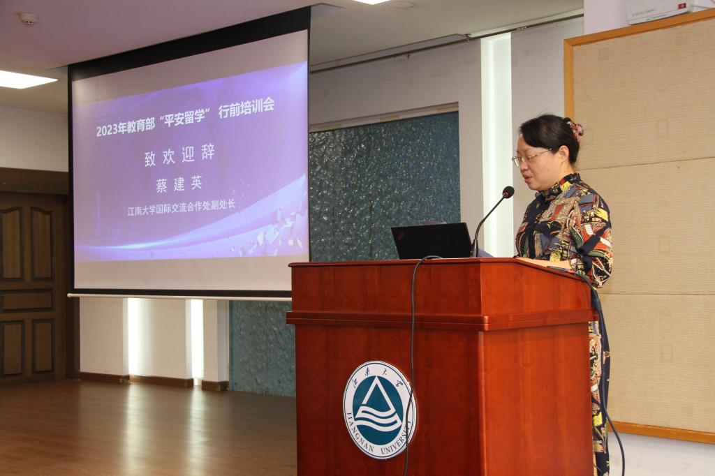 5月27日,由教育部国际合作与交流司主办、教育部留学服务中心承办、江南大学协办的2023年教育部“平安留学”行前培训会在我校文浩馆205报告厅顺利举办。我校国际交流合处副处长蔡建英出席活动并致辞,无锡市公安局出入境管理支队国际合作大队大队长陈刚及相关单位负责人应邀做专题培训,我校马克思学院孙晨光老师、人文学院肖凌燕老师、设计学院钱晓波老师做主题报告。本次培训会由国际交流合处副处长秦洁主持,共有120余名师生参与。