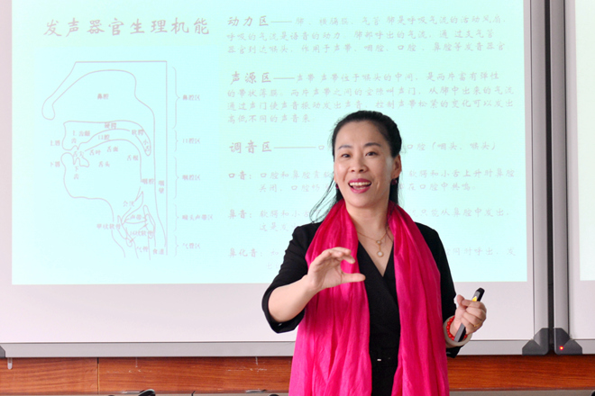 在《嗓音科学训练及保健》主题活动中,美声教授马克指出,教师是以嗓音为载体向学生传授知识,科学发声对课堂教学起着事半功倍的作用。接着,围绕发音的声源系统、动力系统、调音系统,从“声带、气息、发声”依次破题,层层深入,对教师们关注的“鼻音”“喉音”“声带小结”“音量暗闷”等用嗓之惑一一解答。期间,积极与青年教师们进行绕口令、唱歌、诗朗诵等多种形式的互动,他幽默风趣的语言营造了活跃的气氛,现场不时传来阵阵掌声。在《教师科学用嗓护嗓训练方法》至善研修主题中,民乐教授王芳 “以如何造就好声音”引入主题,发问“容貌不好,可以整容;声音不好,可以整嗓”,引导教师思考发音和气息、腔体的关系,接着带领教师进行丹田气息调节、腔体共鸣、嗓音快速放松方法等的训练,与现场教师热烈互动,并寄语教师们嗓子只有一次,要树立嗓音“养护”意识、注意科学用嗓、避免清嗓用嗓过度等不良习惯。