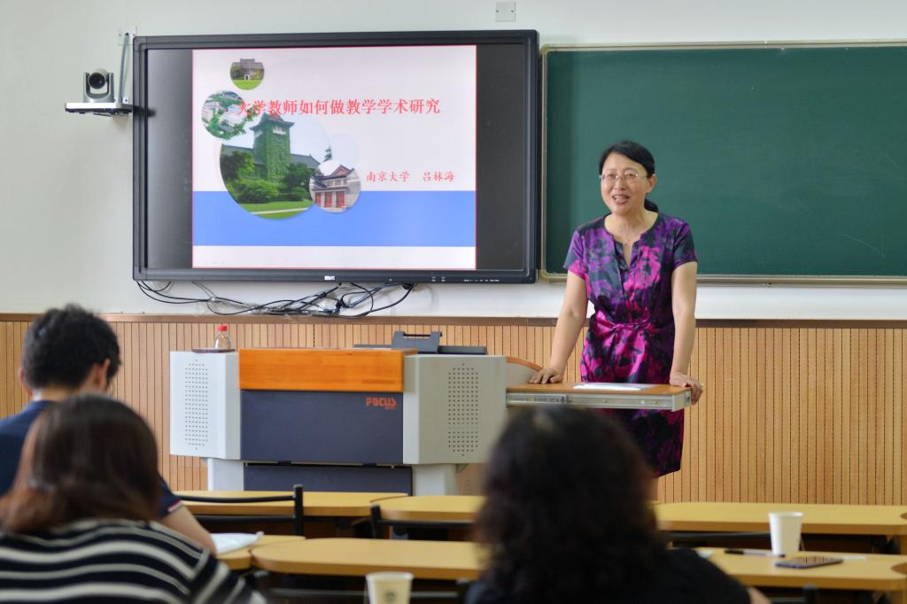 吕林海教授首先追溯了大学教师职责的演变,回顾了“教学学术”产生的背景,再次强调了卡内基教学促进会前主席欧内思特·博耶提出的“教学本身也是一种学术”、“大学的教学应当具有研究性,教学和研究之间应当是同生共进的关系”等观点。吕林海教授认为教学学术就是一种对日常课堂教学进行研究的学问,包含四大内容:课程体系(如课程方案、课程目标、课程内容、课程评价、课程结构等)、教学方法(如合作教学、讲授教学、技术支持的教学、教学环境)、学习特征(如学习方法、学习特点、学习发展)和其他方面(如教师发展、科研与教学的关系、师生关系等),这些都是日常课堂教学可以研究的内容。接着,他系统地向广大师生分享了自己教学学术研究过程中总结的三大方法,即:教学现象背后的问题挖掘、系统地搜集数据来解决问题、写作和表达的方法。针对三种方法吕林海结合自己的研究案例进行了详细讲解。他认为:研究的方法之一,是找到现象背后值得研究的问题,这是“做好教学学术研究”的第一步,是非常重要的,同时提出了问题挖掘的两个关键要素是观察和反思;研究的方法之二,是系统地搜集数据是问题提出后的关键步骤,他详细介绍了定量的问卷调查、定性的访谈与观察以及定性的文本分析三种具体方法;研究的方法之三,就是研究成果的表达和写作,吕林海结合自身的学术论文撰写经验,从论文整体形态、基本结构和基本要求三方面提出了详细的建议。