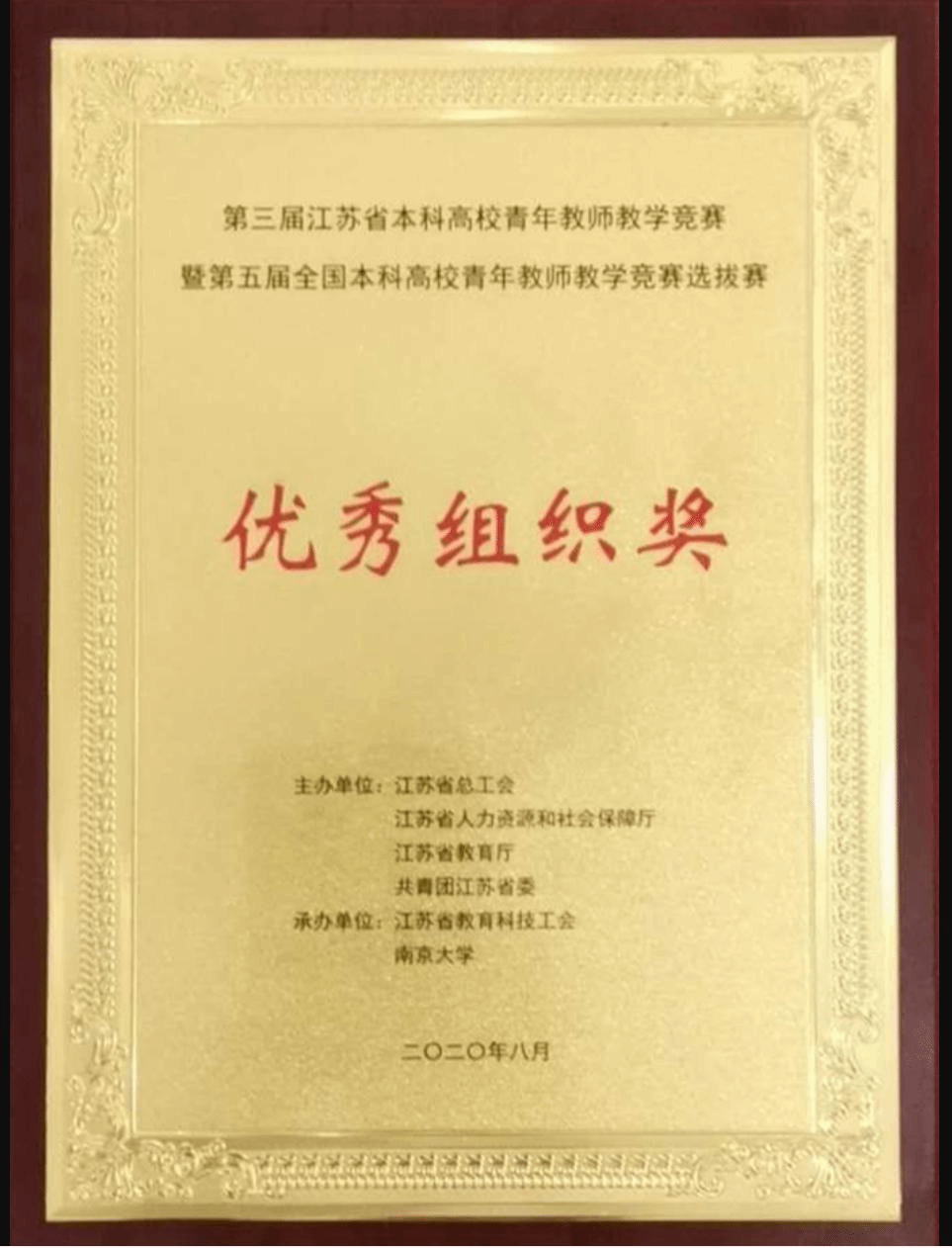 8月21-23日,第三届江苏省本科高校青年教师教学竞赛暨第五届全国本科高校青年教师教学竞赛选拔赛在南京大学举行。我校选派参赛的五位教师均取得优异成绩,医学院吴郁老师获医科组一等奖,并被省总工会授予“江苏省五一创新能手”称号、被省人社厅授予“江苏省技术能手”称号。附属医院康丝丝、商学院陈嘉琪、机械学院徐杰、李志超等老师分别获医学组、文科组、工科组、思政组二等奖。整体赛绩创历史最佳,我校首次荣获竞赛优秀组织奖。