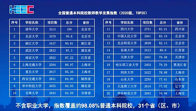 据悉,2020版的本科教师教学发展指数与2019版相比,新增了1个二级指标、13二级指标,全国普通高校总榜单、综合类本科院校分榜单覆盖率分别为98.08%、97.29%,同比均有所上升。指数将有助于高校更科学、全面地把握本校教师教学发展生态,为高校进行自我诊断、对标诊断、持续改进提供有效参考。