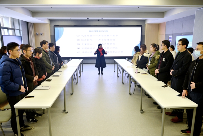 3月12日下午,教学评估与教师卓越中心特邀人文学院副院长王芳教授走进卓越讲坛,为来自12个学院30余位专任教师作题为“美化嗓音、科学用嗓”的教师培训。