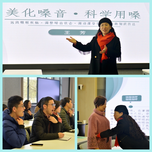 王芳表示,教师是以嗓音为载体向学生传授知识,科学发声对课堂教学起着事半功倍的作用。她结合教师讲课中经常出现的声音沙哑、咳嗽、喉炎、清痰等问题,阐述了原因及解决方法,并从“人体发声原理”“科学发声方法”两个方面进行理论讲解。接着,她还介绍了发声、呼吸等有效的锻炼气息小窍门,并积极与青年教师们开展多种形式的互动,带领大家一起练习,让老师们切身体会到正确的发声和呼吸方式,她幽默风趣的语言营造了活跃的氛围,现场不时传来阵阵掌声。