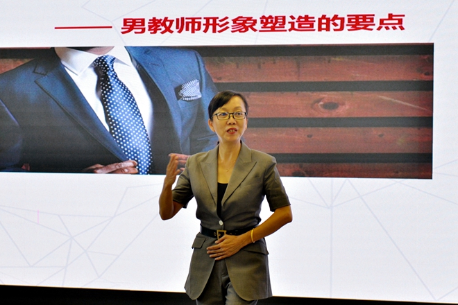 培训分为教师礼仪概述、教师形象塑造、教师的行为仪态、教师礼仪场景应用四部分。关于教师礼仪,龙一平认为是指教师在其工作岗位上,以一定的、约定俗成的方式表现的律己敬人的行为技巧、行为方式,具有强制性、形象性、示范性。接着,龙一平从教师的仪容美、仪态美、仪表美三个方面介绍了教师职业形象设计。她认为教师形象与学校的品牌形象是融为一体的,教师的专业形象在一定程度上显示了本人的专业精神。教师形象设计应遵循视觉语言规律,从学习者视觉体验角度出发,不仅关注教师的知识魅力,还要关注教师外在的知性魅力。她提出教师的仪容应该干净、整洁、端庄;教师的着装应该得体、大方、知性;教师的姿态应该和蔼亲切、精神饱满。