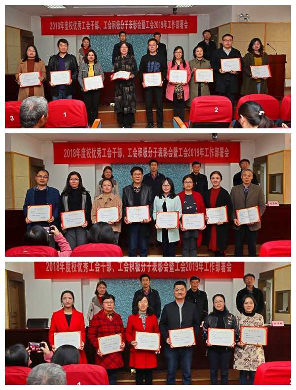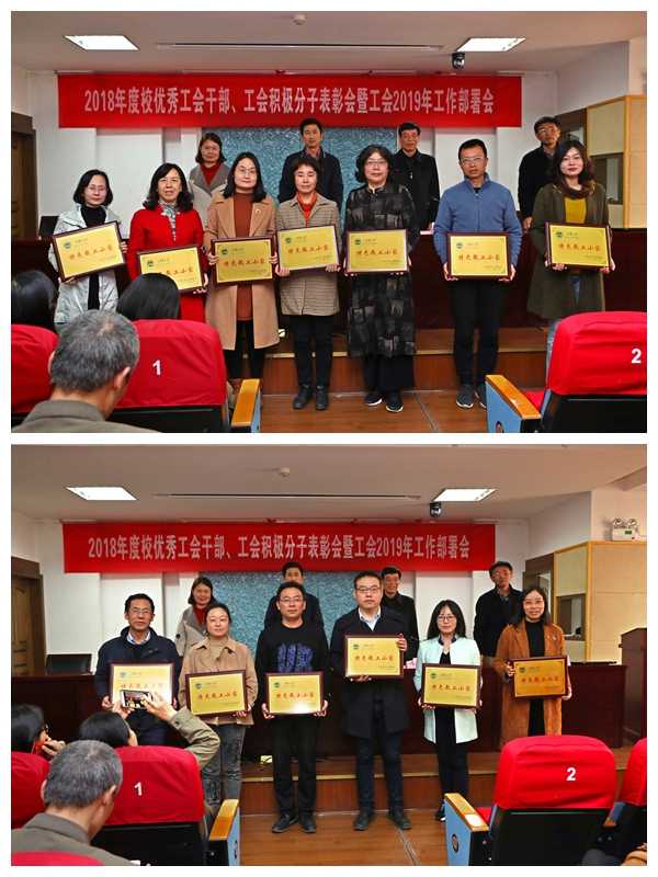 冯群康宣读了表彰决定。2018年,我校各级工会组织深入学习贯彻习近平新时代中国特色社会主义思想、党的十九大精神及工会十七大精神,紧紧围绕学校中心工作,认真履行工会职能,涌现出了一批工会工作先进个人,学校工会对程建敏等45名优秀工会干部和曹春蕾等108名工会积极分子予以表彰奖励。经审核评估,授予纺织服装学院等13个学院(单位)分工会“江南大学特色教工小家”荣誉称号,并对立项项目给予经费支持。与会领导对获得荣誉称号的集体和个人颁发了奖牌和荣誉证书。