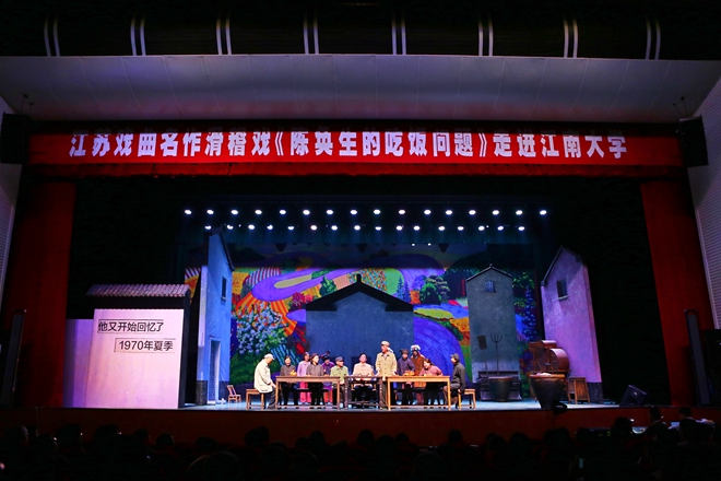 5月13日晚,江苏戏曲名作——滑稽戏《陈奂生的吃饭问题》在我校文浩馆拉开帷幕,常州市滑稽剧团为我校师生带来了一场精彩绝伦的视觉盛宴。千余名师生到场聆听,现场座无虚席,气氛热烈。