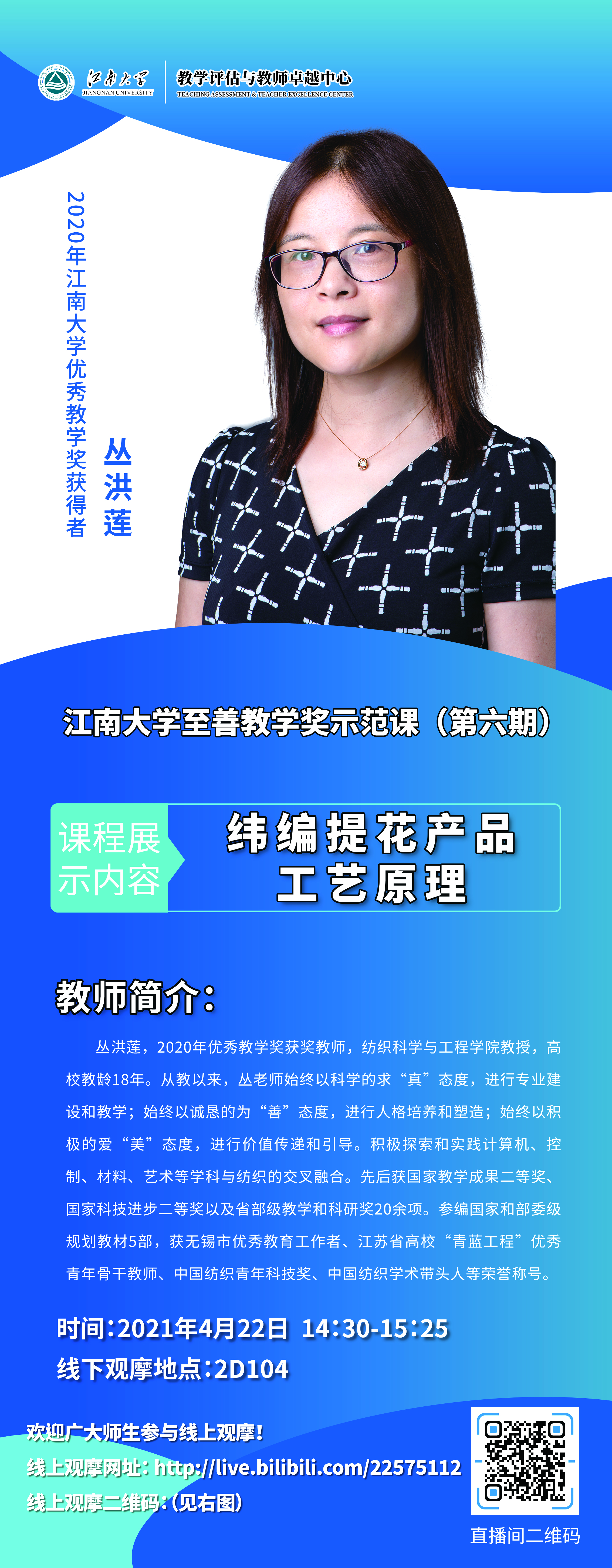 报名方式:请老师们扫描下方二维码,关注“江南大学教学评估与教师卓越中心”微信公众号,进入“学习大厅”进行活动报名。线下报名未成功教师可选择线上观摩学习,线上观摩网址:http://live.bilibili.com/22575112