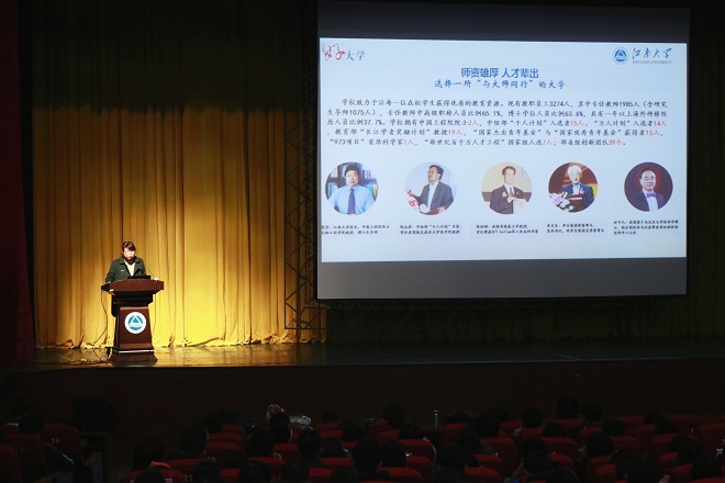 1月10日晚,2019年“江南学子中学行”招生宣传寒假社会实践动员暨培训大会在文浩馆召开。招生就业处副处长张婕英,招生科科长苏晓晋出席会议。2019年“江南学子中学行”招生宣传寒假社会实践经过前期宣传动员、学生组队报名和学校审核程序,最终从4100余位报名学生中遴选了2692名,组建561支团队,前往27个省(区、市)的642所省级重点中学进行招生宣传。1200余名团队负责人和学生代表参加了本次培训,招生就业处李金杰主持会议。