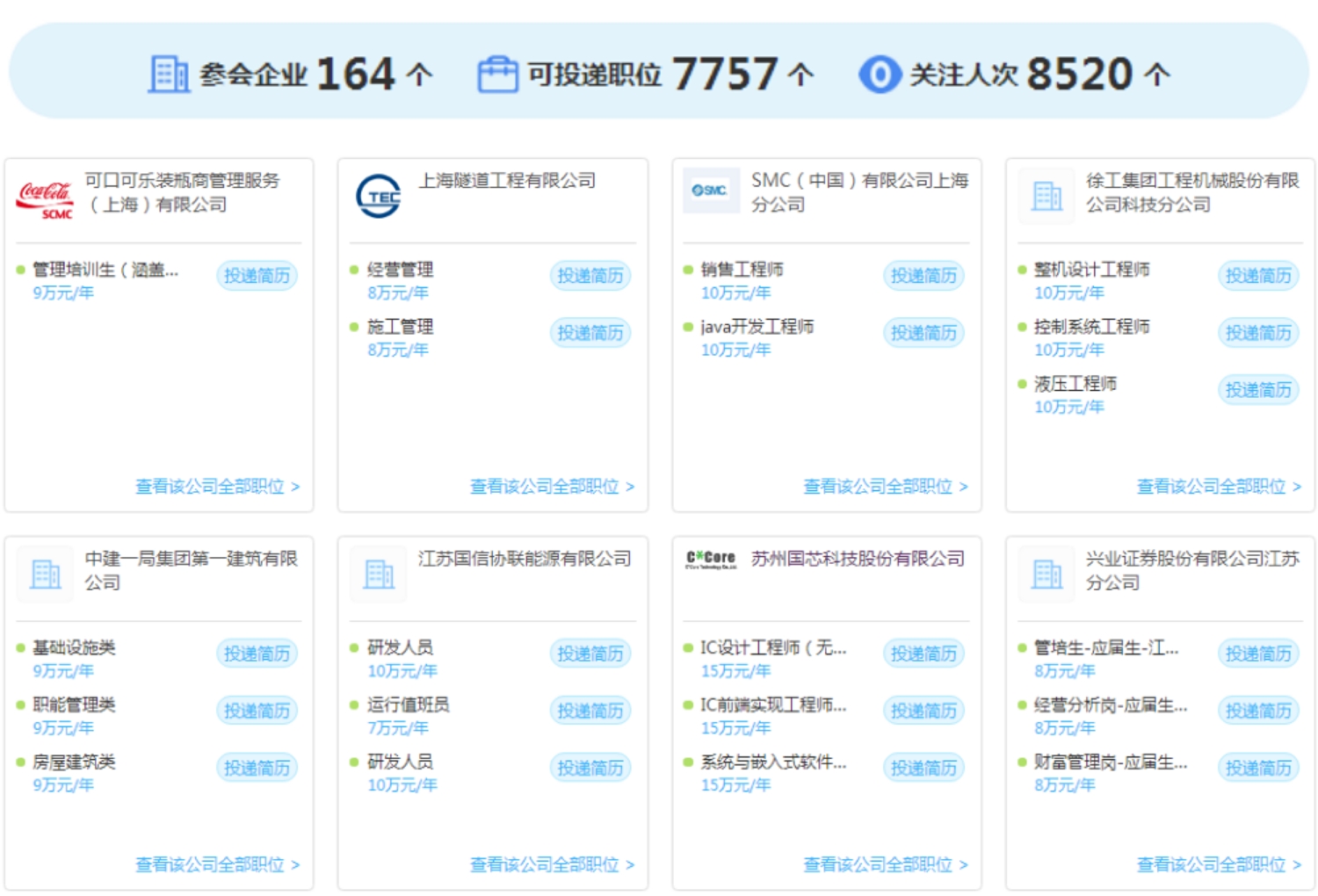 在本次双选会组织筹备过程中,学校紧密依靠董事会、校友会各地分会、行业分会和学院分会广泛宣传发动,广大校董和校友企业积极响应;招生就业处和社会资源处全天候提供在线咨询服务,精准邀请、充分挖掘用人单位资源,拓展毕业生就业渠道。经过筛选,共有来自上海、北京、江苏、广东、浙江、湖北等地的164家校董、校友企业参会,涵盖食品加工、生物医药、软件和信息技术服务业、通用设备制造业、商业服务业、房屋建筑业、教育、纺织业、金融业等众多行业领域,岗位需求涉及本、硕、博各个学历层次,提供的岗位薪资本科达9.7万/年,硕士生11.2万/年,博士生20.75万/年。在本次双选会期间,我校学生向校董、校友企业投递简历2097份,开展云端沟通面试230人次,实习或签约意向正在进一步达成中。