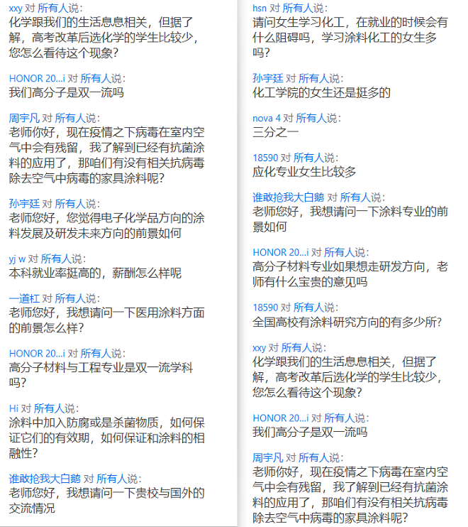 刘教授生动活泼而又严谨详实的讲解引发了同学们极大的兴趣,纷纷在留言区提问,刘教授就涂料对于身体是否有影响、女生学习化学是否有阻碍以及专业就业率等相关问题做出了细致的解答,为考生选择专业提供了可靠的参考。