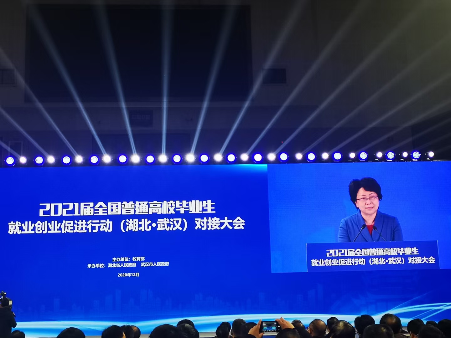 12月2日,2021届全国普通高校毕业生就业创业促进行动对接大会启动仪式在湖北武汉洪山体育馆举行。教育部党组成员、副部长翁铁慧,湖北省委常委、武汉市委书记王忠林出席大会启动仪式并讲话。我校作为首批教育部毕业生就业创业“一帮一”行动高校,受邀参会。