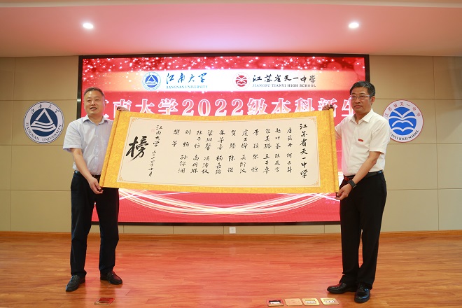 陈卫指出,江南大学是我们家门口的好大学,今年学校录取天一学子的专业涉及食品学院等11个学院,录取分布在临床医学等16个专业。其中11个专业为国家级一流本科专业,5个专业为省级一流本科专业,国家级、省级一流本科专业覆盖率100%,有响应“健康中国”国家发展战略的软科世界排名第一的食品科学与工程、食品质量与安全专业;有“北清华、南江大”“设计界的黄埔军校”之美称的工业设计专业;与无锡大力共建发展的临床医学专业,与“智造中国”国家发展战略与无锡产业集群相契合的物联网工程、微电子科学与工程、人工智能等。江南大学与天一中学有着长久的战略合作关系,江南大学也将不断深化“双高”合作,向天一学子完全开放科技资源,努力共谱育人华章。2021年,江南大学制定十年“奋进计划”,为实现学校跻身世界一流大学建设行列的中长期愿景,造就更强的学科、更强的人才、更强的师资,在此邀请各位新同学,永葆天一的气质和精神,四年后,希望有机会给在座的21位同学亲自颁发“江南大学校长特别奖”,这是江南大学学生最高荣誉奖项,希望同学们为我们共同的美好未来踔厉奋进,奋勇争先!