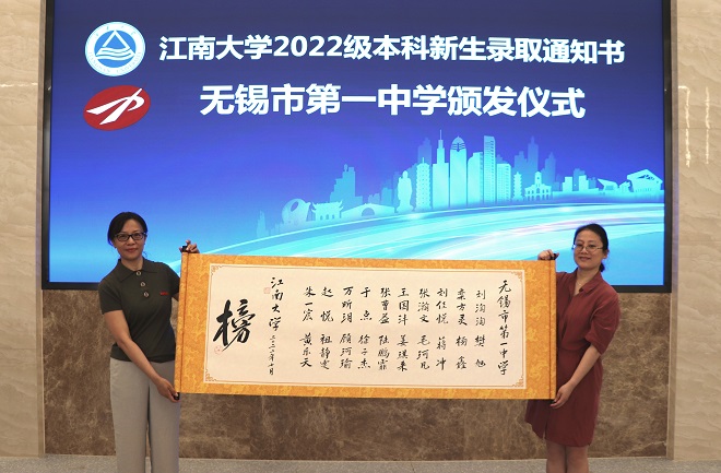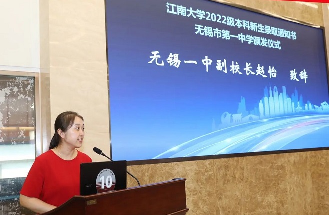 赵怡代表无锡市第一中学致辞。她对江南大学领导老师一行的到访表示热烈地欢迎,感谢江南大学长期以来对无锡市第一中学的关心和支持。同时祝贺20名高三毕业生成功考入江南大学这所家门口最好的大学,并在这个奋斗了三年青春的校园内领取到了江南大学专程送来的录取通知书,金榜题名,圆梦江南。她表示,今天的录取通知书颁发仪式也是一场交接仪式,希望所有同学秉承无锡一中优良传统,在人生新的起点上,在美丽的江南大学校园里,努力学习,脚踏实地,戒骄戒躁,努力成为堪当民族复兴重任的时代新人。