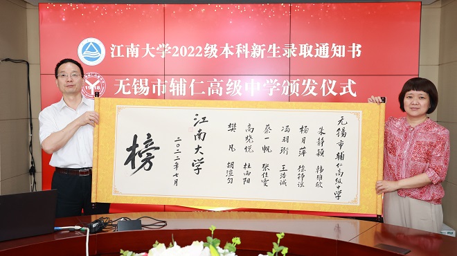 随后,堵国成宣读2022年录取江南大学的12位辅仁学子名单并亲自颁发录取通知书和入学纪念品,并向马彩红赠送由江南大学设计学院教授吴宇华亲笔题写的金榜题名喜报。