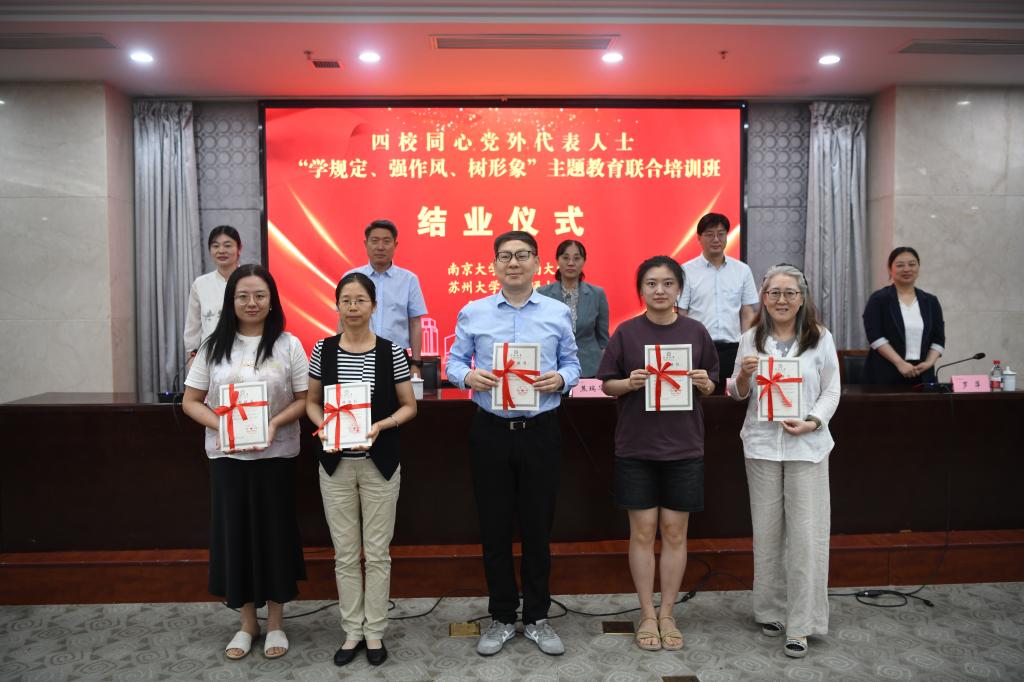 江南大学党委统战部副部长蒋艳主持结业式。焦瑞华在总结讲话中指出,高校党外代表人士一要提高政治站位,提升政治思想新高度;二要自觉以身作则,以学正风,勇担责任使命,塑造作风建设新面貌;三要立足本职岗位,创造干事创业新成就;四要着力作用发挥,在建设教育强国、科技强国、人才强国中积极贡献“金点子”,成为双岗建功的先进典范。她希望四校以此次培训为契机,深化友谊、凝聚共识,不断续写团结奋进的新篇章。