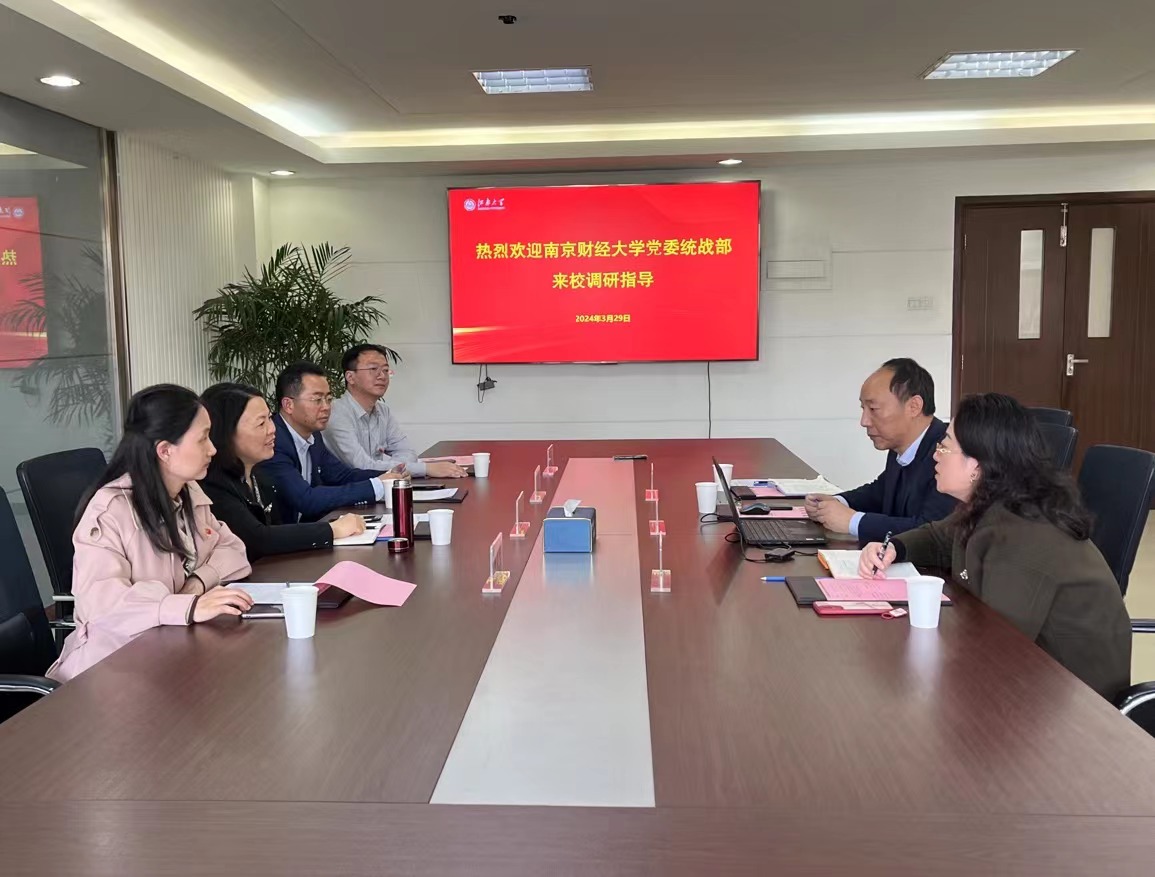 为进一步深入贯彻落实习近平总书记关于做好新时代党的统一战线工作的重要思想,促进高校统战工作高质量发展,加强校际交流互鉴,3月29日下午,南京财经大学党委常委、统战部部长李玉琴一行来校进行专题调研。我校党委常委、统战部部长朱飞,党委统战部副部长王冰等参加调研座谈。