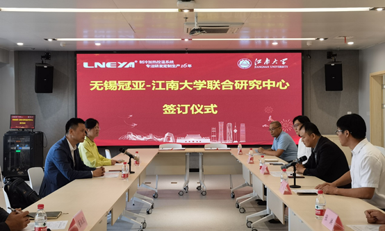 颜厥枝和赵军华分别代表企业和学校签署《无锡冠亚-江南大学联合研究中心共建协议》。此次双方签约3年,致力解决行业难题,推动产品创新。